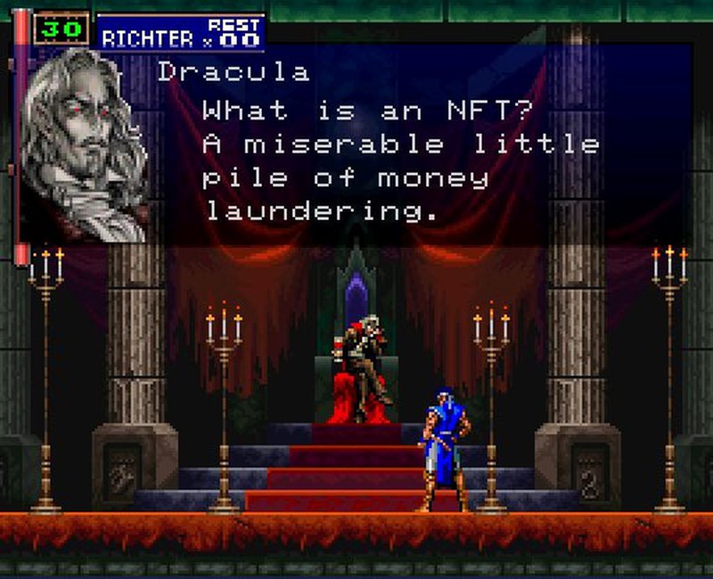 Castlevania-fans var inte entusiastiska över meddelandet om tokenförsäljning. Den mest populära reaktionen just nu ser ut så här: I Castlevanias omarbetade skärmdump jämför Dracula NFT med penningtvätt.